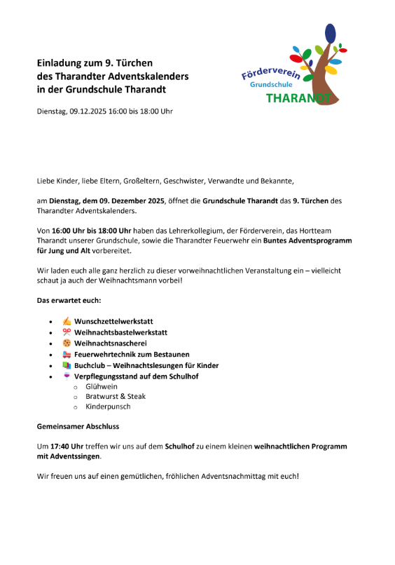 Liebe Kinder, liebe Eltern, Großeltern, Geschwister, Verwandte und Bekannte, am Dienstag, dem 09. Dezember 2025, öffnet die Grundschule Tharandt das 9. Türchen des Tharandter Adventskalenders. Von 16:00 Uhr bis 18:00 […]